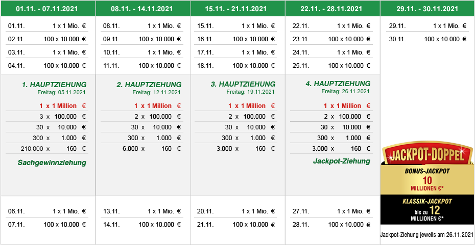 Jeden Monat mindestens 10 Millionen € im Spiel. Im Verlauf der 147. Lotterie kann die Gesamtgewinnsumme beider Jackpots auf bis zu 50 Millionen € anwachsen.