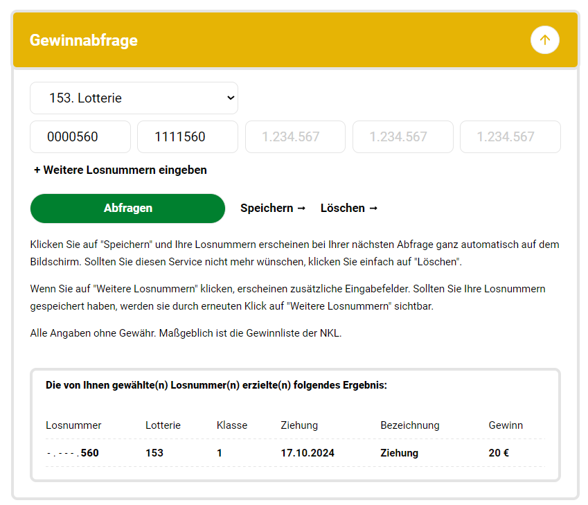 Bei der getrennten Eingabe von zwei verschiedenen Losnummern erscheint je Losnummer eine Gewinnangabe. (hier beispielhaft die Losnummern 0.000.560 und 1.111.560 für den NKL EXTRA-Joker)