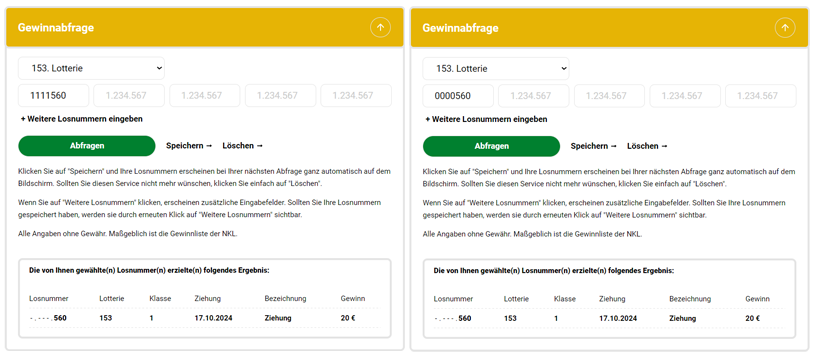Werden beide Losnummern gleichzeitig eingegeben, erscheint ebenfalls nur eine Gewinnangabe mit denselben letzten drei Ziffern. Dies liegt an unserem besonderen Ziehungsverfahren, der so genannten Endziffernziehung: